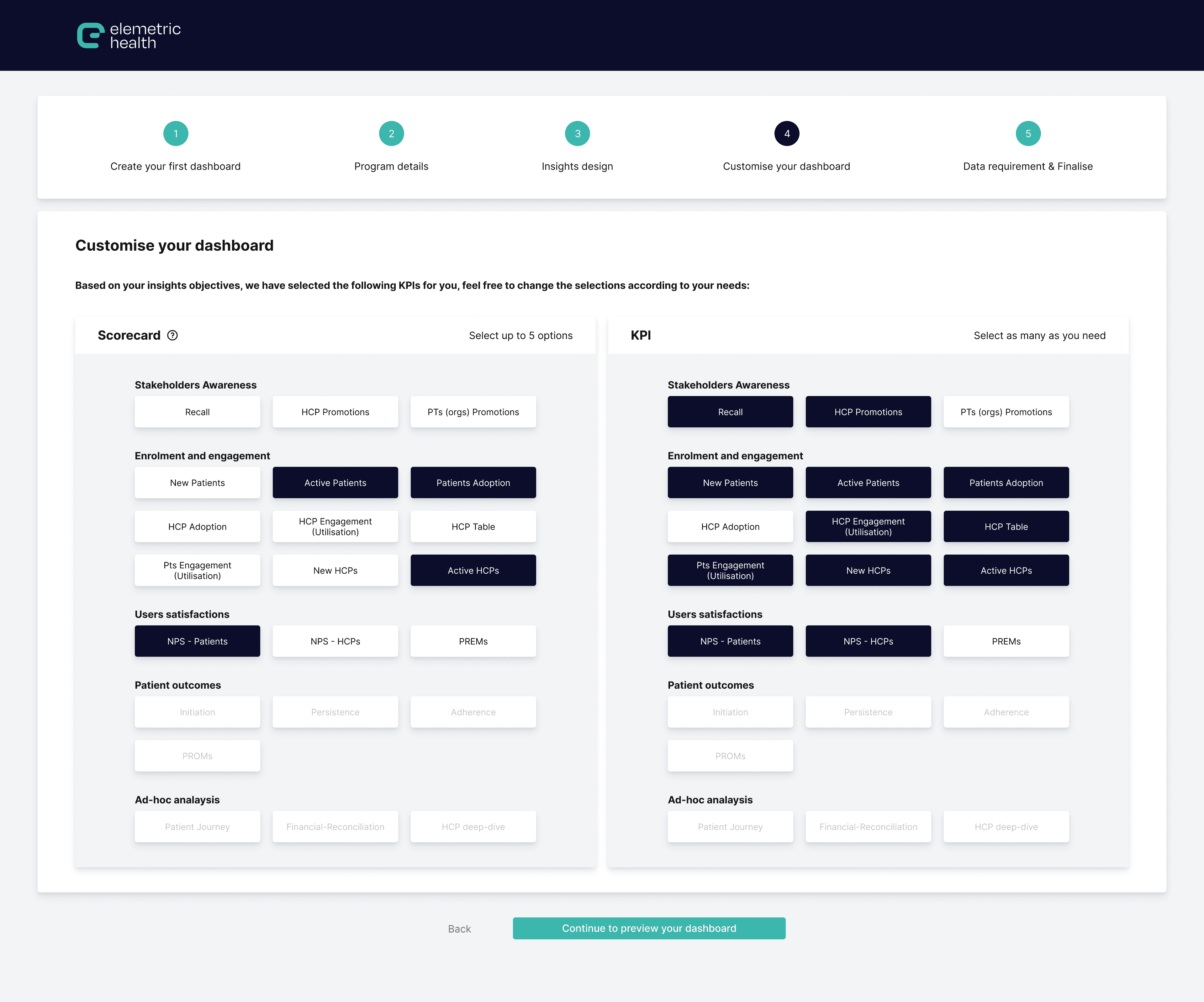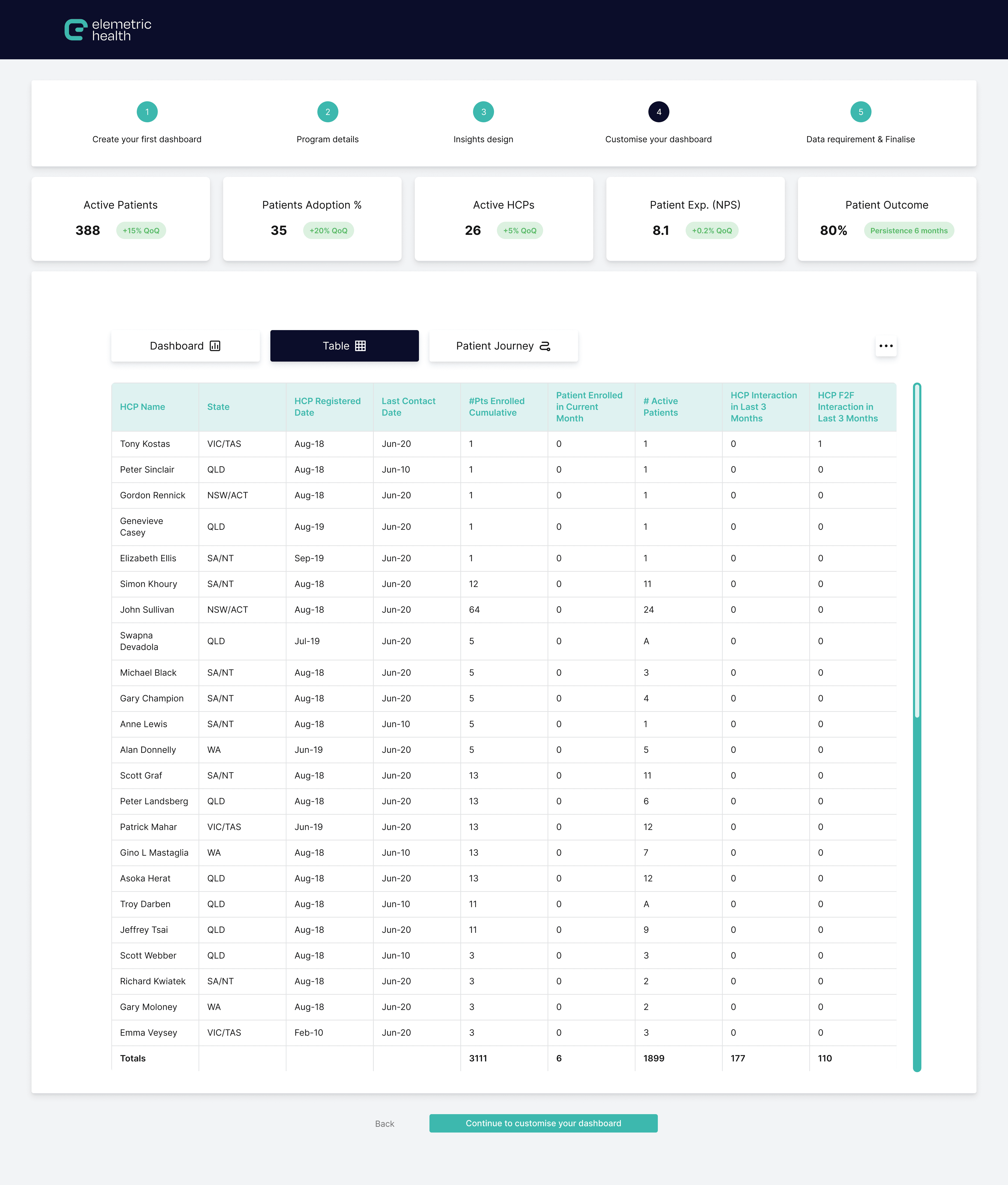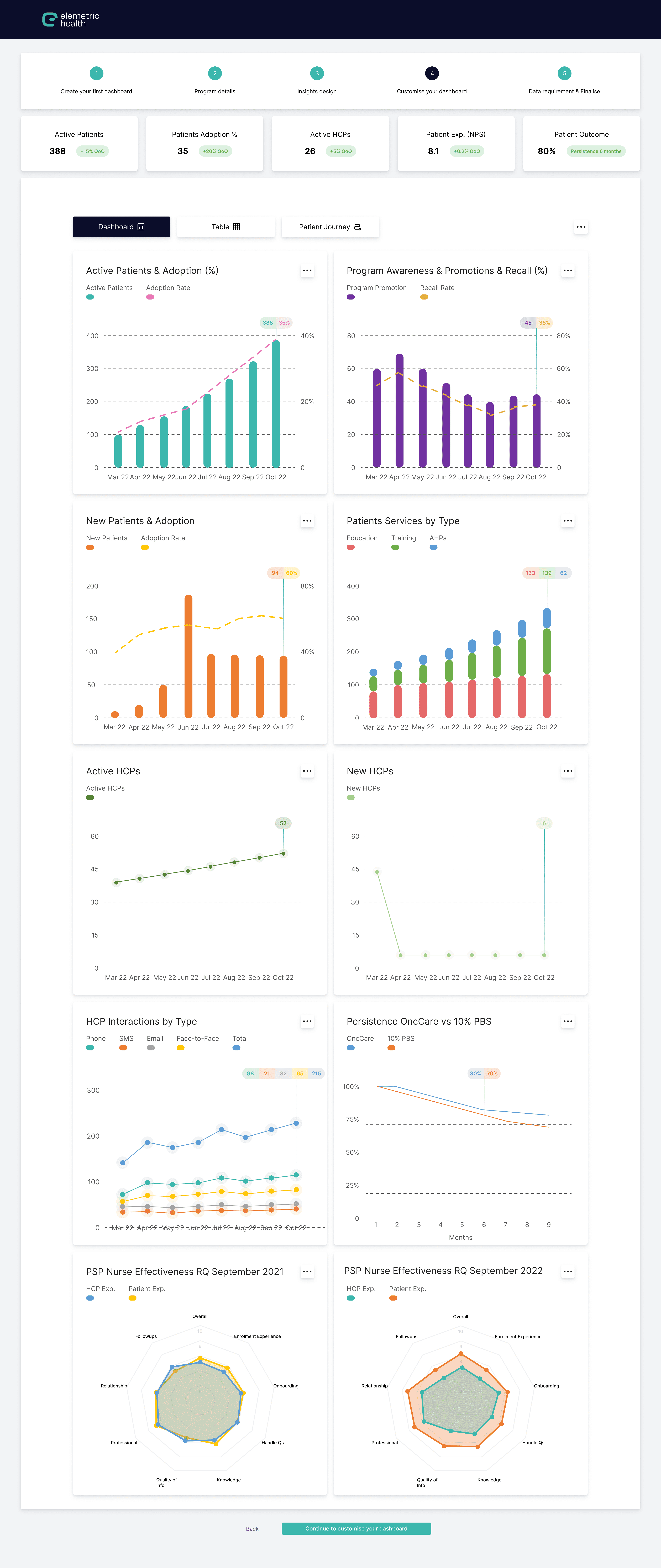 To support this vision, the primary objective was to transform the idea from spreadsheets into an interactive prototype. This included incorporating sample data visualisations and KPI metrics to better guide healthcare professionals in developing customised patient support programs.